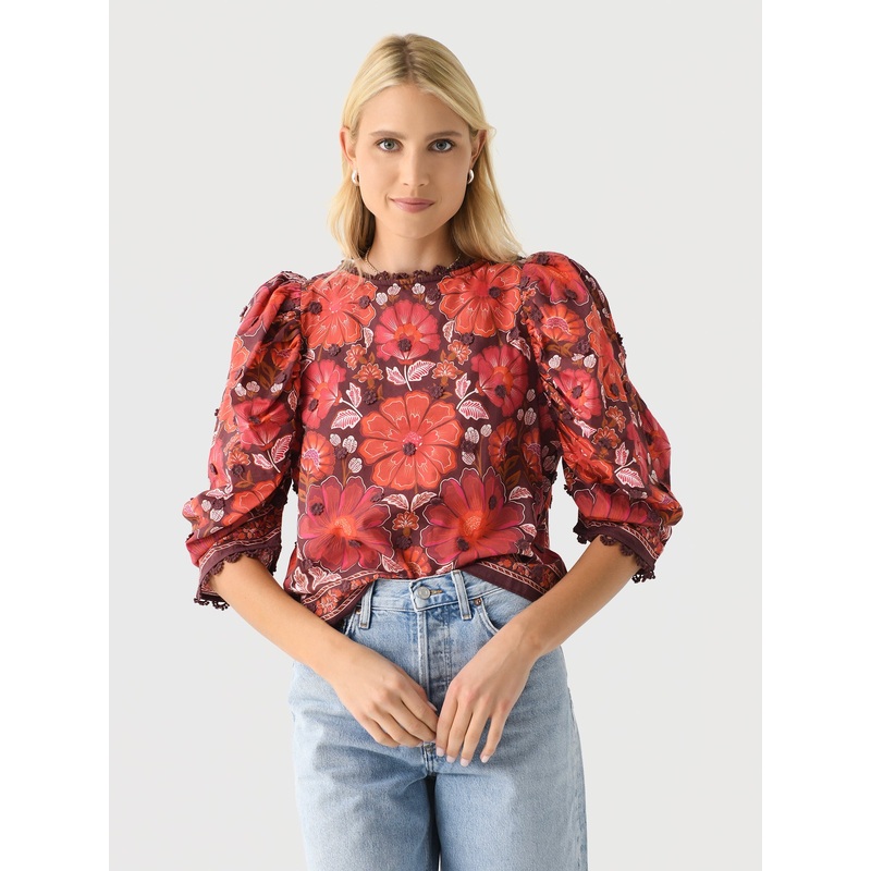 DESCRIPTION:The Gigi Tapestry Brown Blouse is a stunning example of Farm Rio's unique style. Its rich brown and deep red floral print is both captivating and elegant. The high neckline and puffed sleeves create a timeless silhouette, while the intricate pa