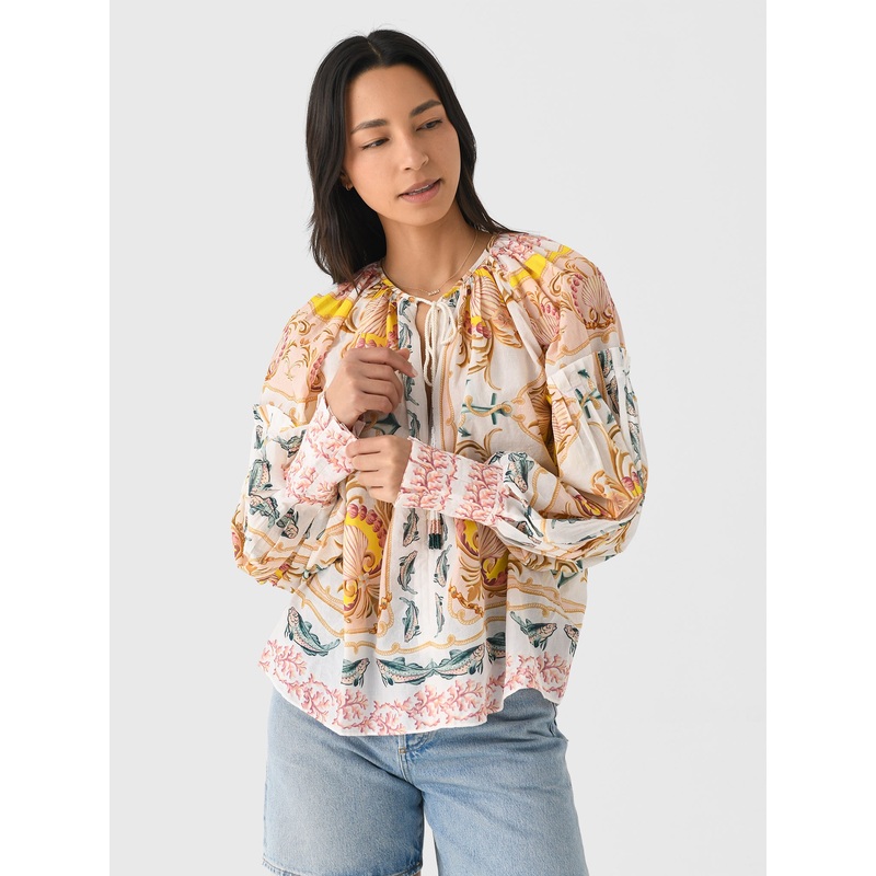 DESCRIPTION:A flowy blouse made from lightweight cotton featuring blouson sleeves and a muted pink maritime-inspired print.FEATURES:Self-Tie NecklinePartial Button PlacketBlouson SleevesAll-Over Novelty Print100% CottonRelaxed FitModel is wearing size Smal