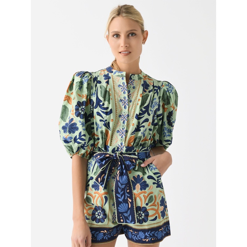 DESCRIPTION:A lightweight cotton romper with a button closure, half-length balloon sleeves, and a self-tie belt.FEATURES:Band CollarHalf-Length Balloon SleevesButton-Down FrontSelf-Tie BeltSide PocketsInseam: 3 in.All-Over Novelty Print100% CottonClassic F