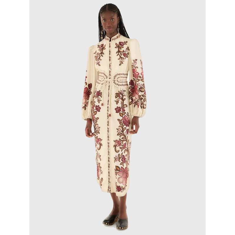 DESCRIPTION:This graceful dress features a high neckline and a fluid, midi-length silhouette. It blooms with a floral pattern in warm rose, burgundy, and earthy tones, and has puff sleeves and an embroidered belt to create a feminine, cinched waist.FEATURE