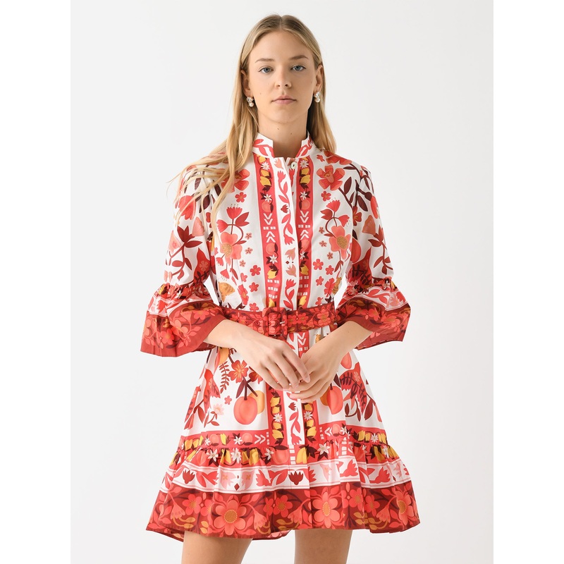 DESCRIPTION:A whimsical mini dress adorned with large ruffle trims and an enchanting floral print.FEATURES:High NecklineHalf-Length SleevesRuffle CuffsHidden Button PlacketAdjustable BeltFlounce HemMini SilhouetteAll-Over Novelty Print100% CottonClassic Fi