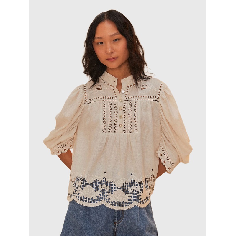 DESCRIPTION:Embrace charming elegance with this blouse, where delicate eyelet details playfully dance across its high neckline and puffed sleeves.FEATURES:High NecklinePartial Button PlacketHalf-Length Puff SleevesRichelieu EmbroideryScalloped Hem55% Linen