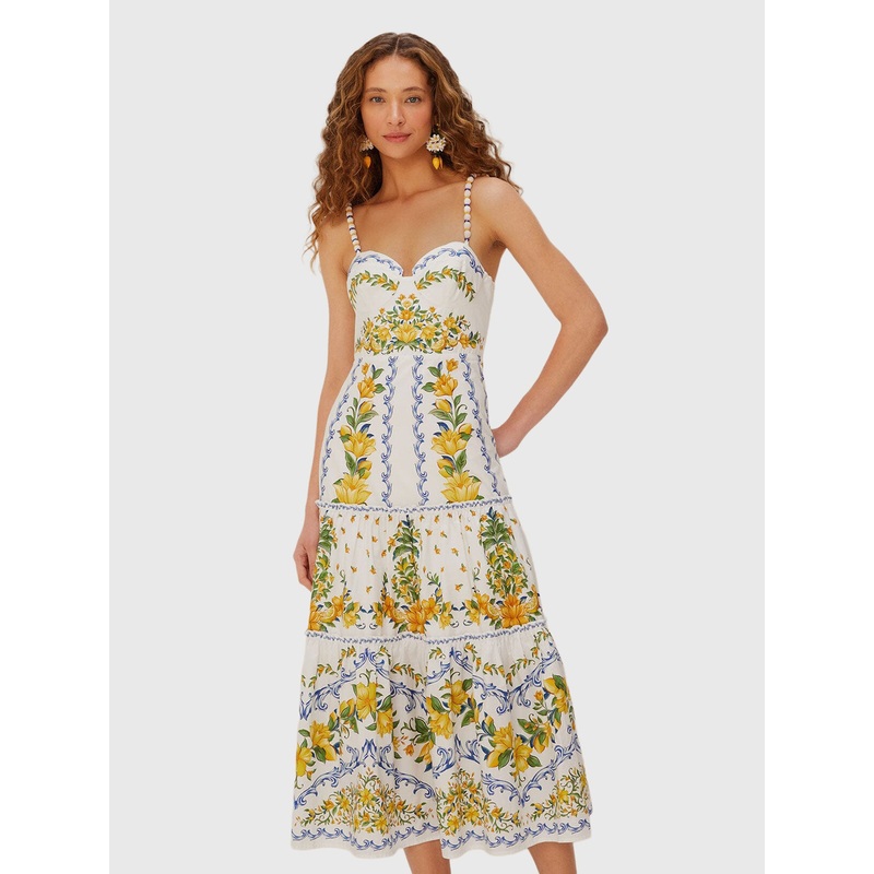 DESCRIPTION:Embrace summer's essence with the Sicily Midi Dress. Crafted from responsible materials, it features a captivating sweetheart neckline, playful shoulder straps, and vibrant yellow and green florals that evoke a joyful, dreamy vibe. FEATURES:Swe
