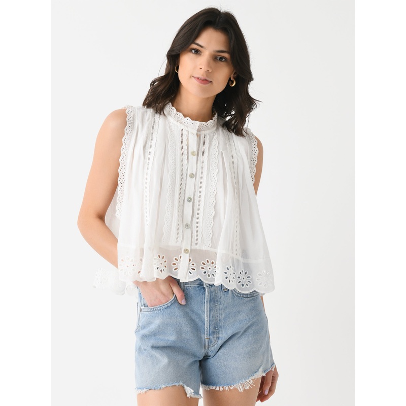 DESCRIPTION:An airy blouse made from lightweight organic cotton with inset lace details and eyelet trims.FEATURES:Round NecklineSleevelessButton-Down FrontEyelet Embroidery Details100% Organic CottonClassic FitModel is wearing size Small blouse.Model's Mea