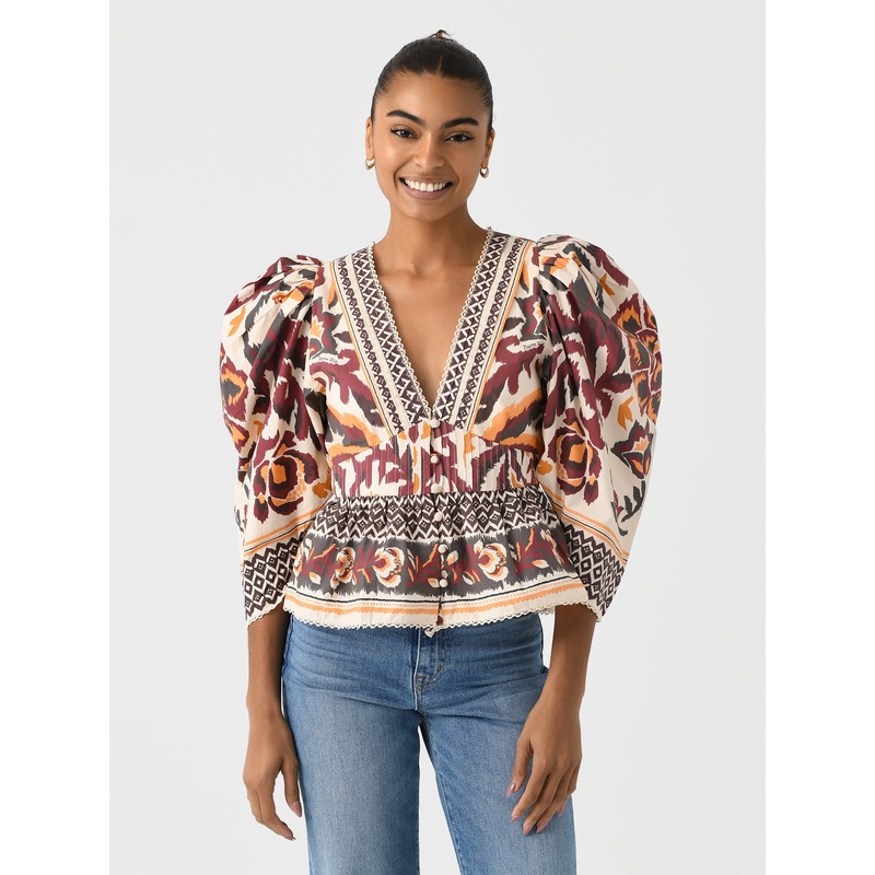 DESCRIPTION:A lightweight blouse featuring a deep v-neckline, voluminous puff sleeves, and a covered button closure.FEATURES:V-NecklinePuff SleevesCinched WaistButton ClosureWide Peplum HemEyelet TrimsAll-Over Novelty Print100% CottonClassic FitModel is we