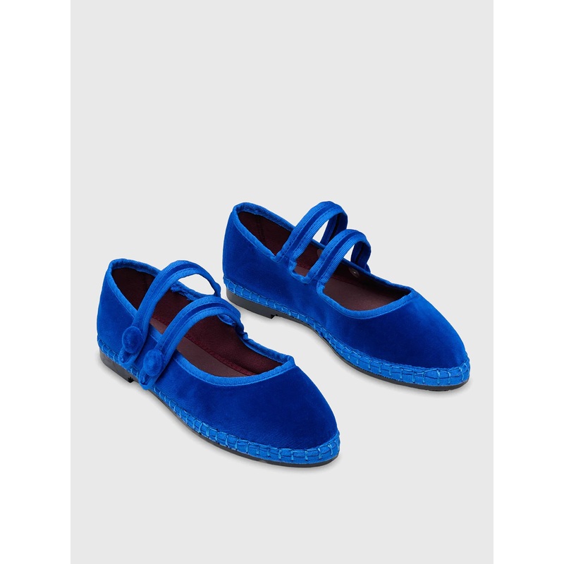 DESCRIPTION:A vibrant blue flat with a soft velvet upper and a double strap detail.FEATURES:Round ToeDouble StrapsUpper: Cotton VelvetOutsole: Recycled Rubber
