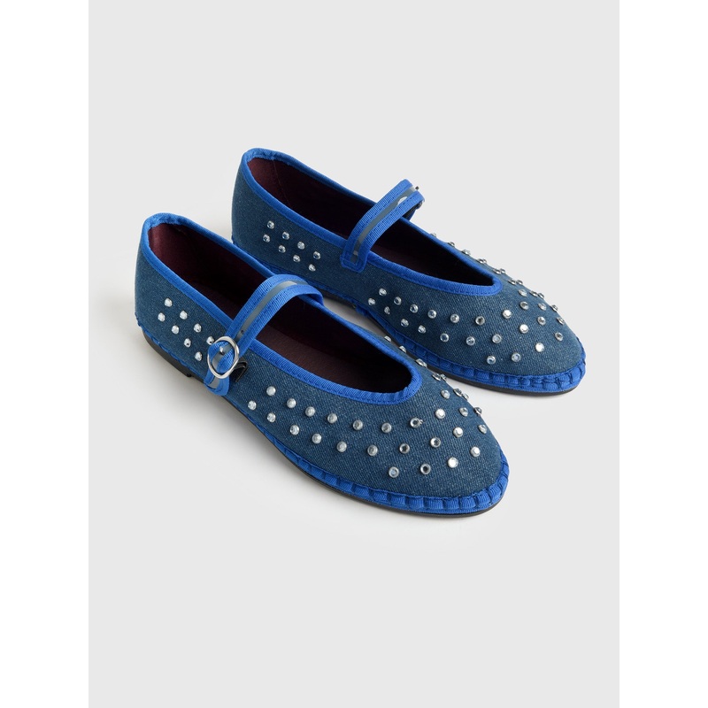 DESCRIPTION:A ballerina-inspired flat made from cotton denim and finished with crystal embellishments and an adjustable buckle.