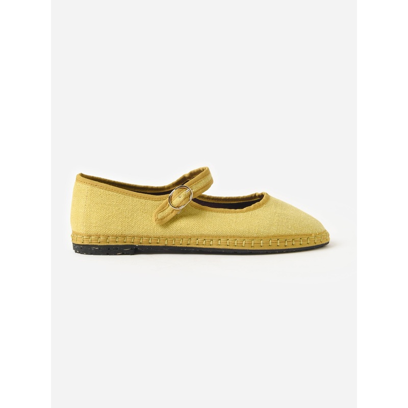 DESCRIPTION:A Mary Jane flat made from mustard-colored canvas material with a non-slip sole.FEATURES:Round ToeAdjustable BuckleUpper: Linen CanvasNon-Slip Sole