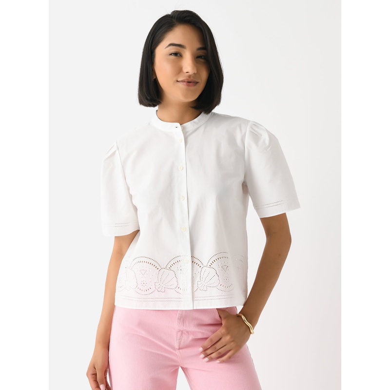A boxy button-down shirt made from cotton poplin with coastal-inspired embroidered eyelet detailing.