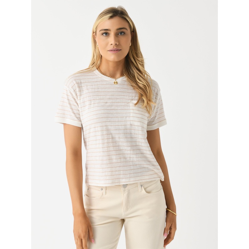 DESCRIPTION:A striped tee made from soft and breathable organic linen fabric.FEATURES:Crew NecklineDropped ShoulderLeft Chest PocketBanded CuffsAll-Over Stripe Print100% Organic LinenClassic FitModel is wearing size Small tee.Model's Measurements: Height: