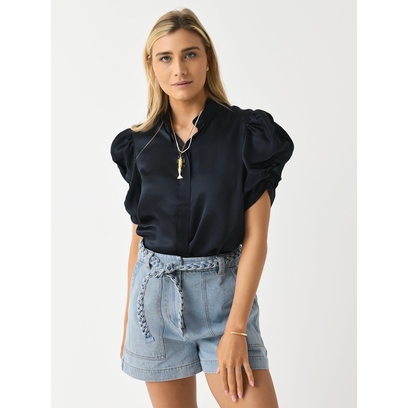 DESCRIPTION:A silk puff sleeve blouse with a delicate dot jacquard design.FEATURES:Stand-Up CollarPuff SleevesHidden Button-Down PlacketAll-Over Novelty Print100% SilkClassic FitModel is wearing size Small blouse.Navy: Model's Measurements: Height: 5'9" |