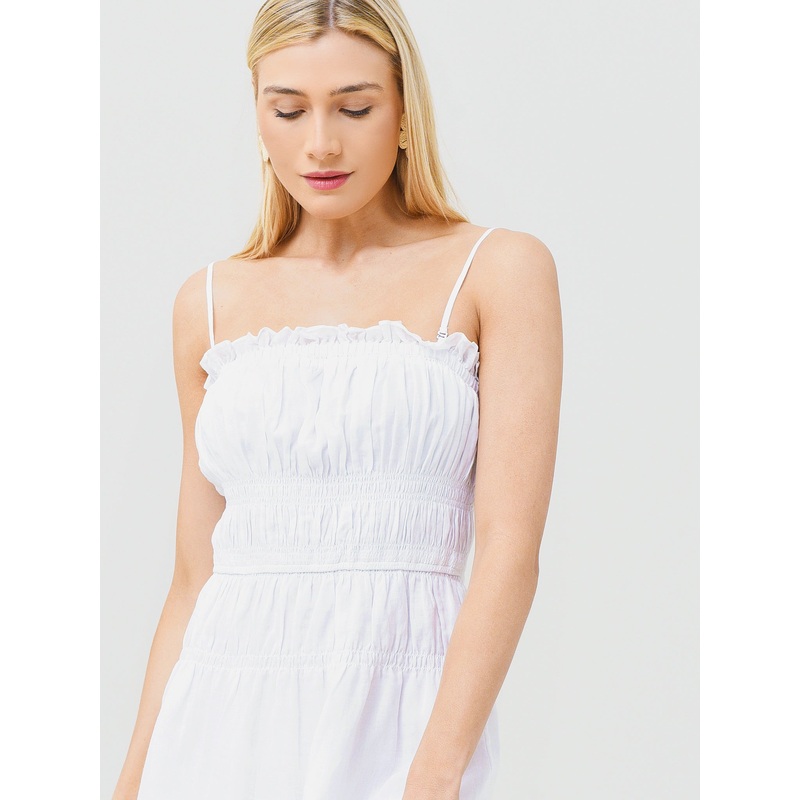 DESCRIPTION:Midi dress with removable straps and a smocked waist.FEATURES:Midi DressSquare Neckline with Ruffle TrimAdjustable, Removable Spaghetti StrapsSmocked WaistTiered SkirtLightweight FabricationShell: 100% Ramie | Lining: 100% CottonClassic FitMode