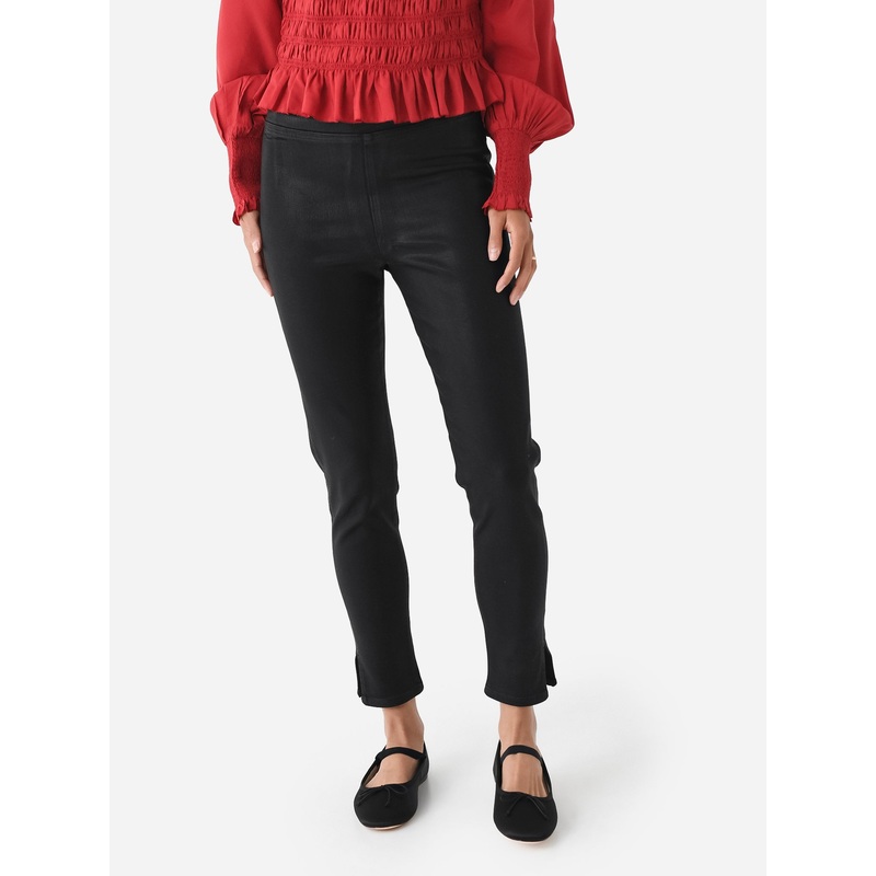 DESCRIPTION:The perfect travel-day jean featuring excellent shape recovery and a cropped skinny leg with a subtly luminous coated finish.FEATURES:High Rise - 10 in.Elastic WaistbandNo PocketsSide Ankle SlitSkinny SilhouetteInseam: 27 in.Coated Super Stretc