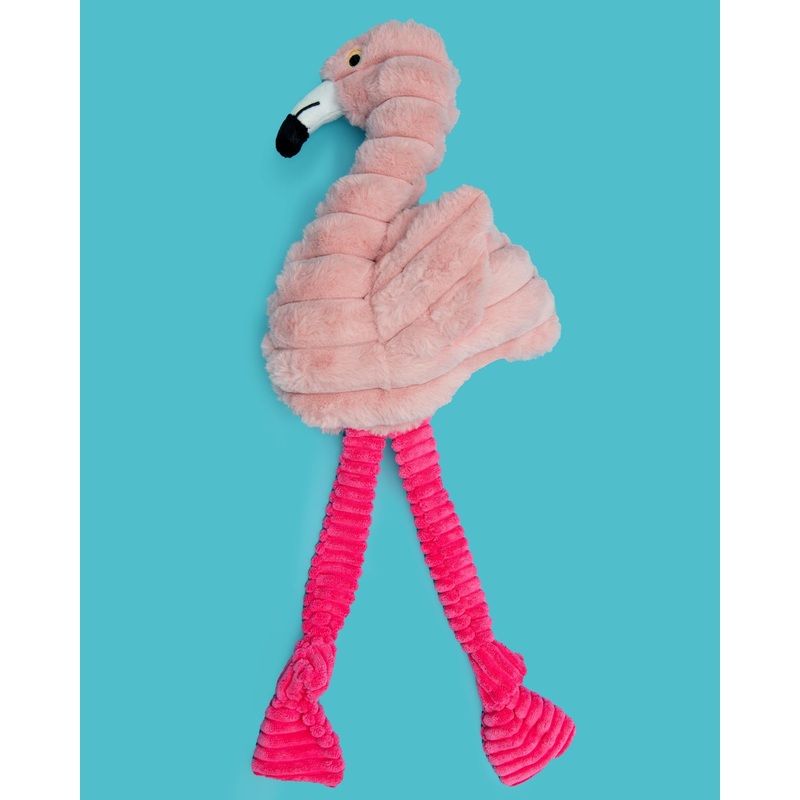 Hey Franny, time to flaunt those feathers!26" long flamingo-shaped dog toy.Made of new rich and soft plush in vivid color with embroidered eyes for safe play.An additional layer of fabric underneath the plush adds extra durability.Contains squeakers in the