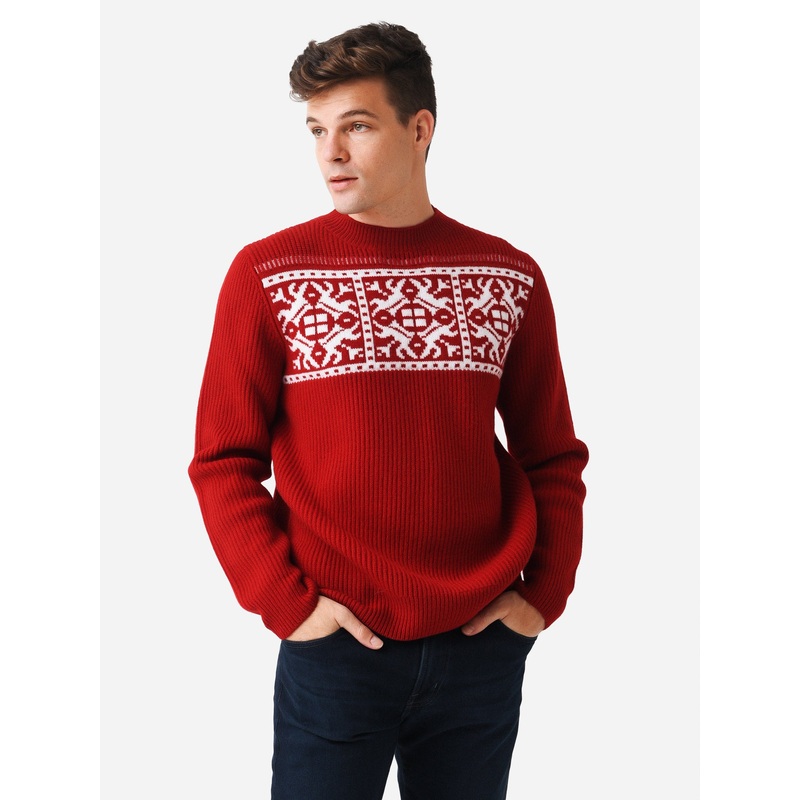 DESCRIPTION:Knit sweater made from soft wool.FEATURES:SweaterCrew NecklineJacquard MotifLong SleeveKnit Fabrication100% WoolStraight HemClassic FitModel is wearing size Medium sweater.Ruby: Model's Measurements: Height: 6'0" | Waist: 32" | Inseam: 32" | Co