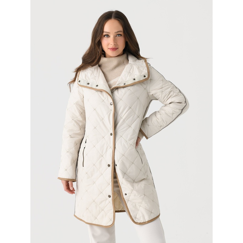 DESCRIPTION:Lightweight down-insulated quilted coat with a long silhouette.FEATURES:High NecklineFixed HoodSide Zip PocketsSnap Button ClosureWind & Water-ResistantQuilted FabricationInsulation: 80g High-Down FleeceShell: 98% Nylon, 2% LeatherClassic FitMo