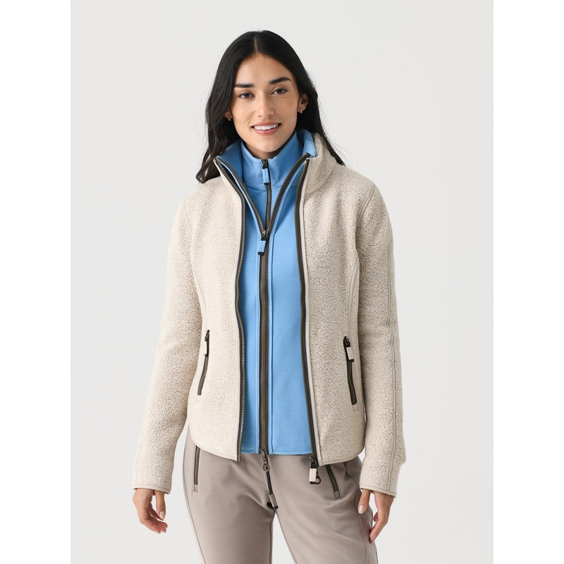 Fleece-wool jacket with optimal thermal performance and a rounded feminine hem.