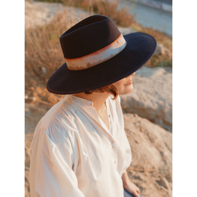 DESCRIPTION:Felt hat with an ombre hand-dyed ribbon detail.FEATURES:HatPinched CrownWide BrimHand-Dyed Ombre Silk RibbonFelt FabricationSPF 50 Sun ProtectionMade in Ecuador