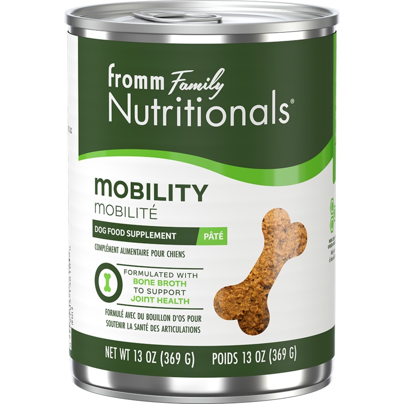 Fromm Canned Dog Food Nutritionals Mobility Supplement Pate 13ozMobility-supporting pt containing a blend of bone broth, glucosamine, New Zealand green mussels, egg shell meal, turmeric, and chondroitin to help support healthy cartilage, bones, and connect