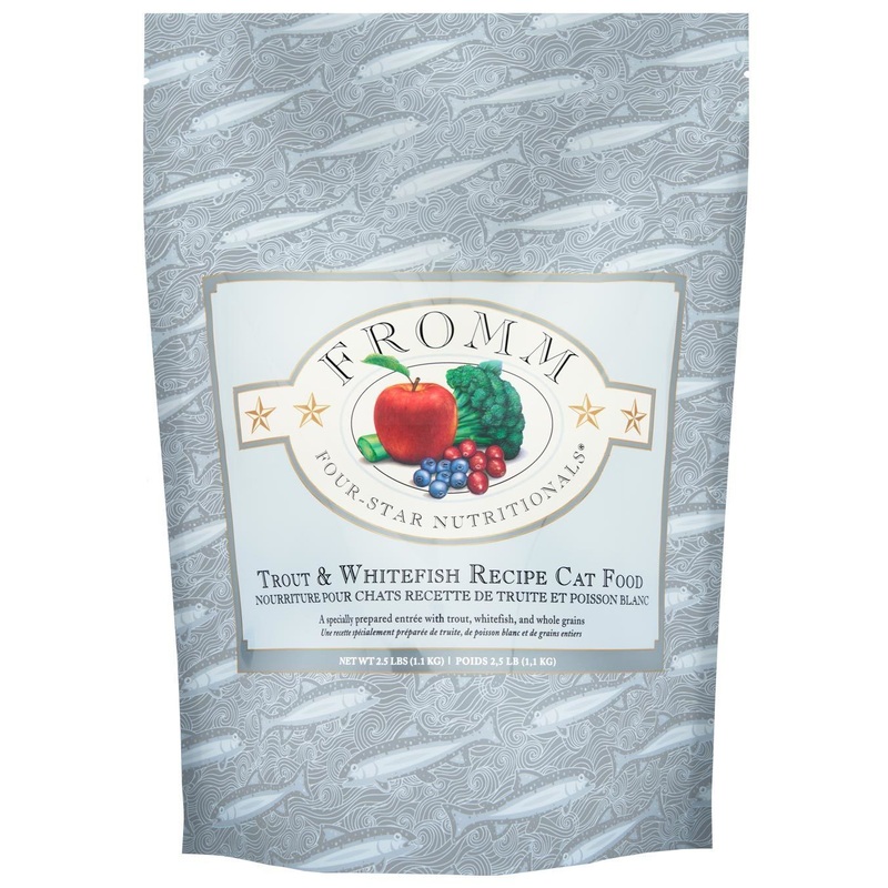 Trout, Whitefish, Menhaden Fish Meal, Dried Egg Product, Salmon Meal, Whole Barley, Whole Oats, Brown Rice, Natural Flavor, Canola Oil, Oatmeal, Pearled Barley, Salmon Oil, Dried Tomato Pomace, Miscanthus Grass, Flaxseed, DL-Methionine, Broccoli, Apples, Vitamins, Chicory Root Extract, Taurine, Sorbic Acid (Preservative), Minerals, Salt, Cranberries, Yucca Schidigera Extract, Sodium Selenite, Blueberries, Probiotics.