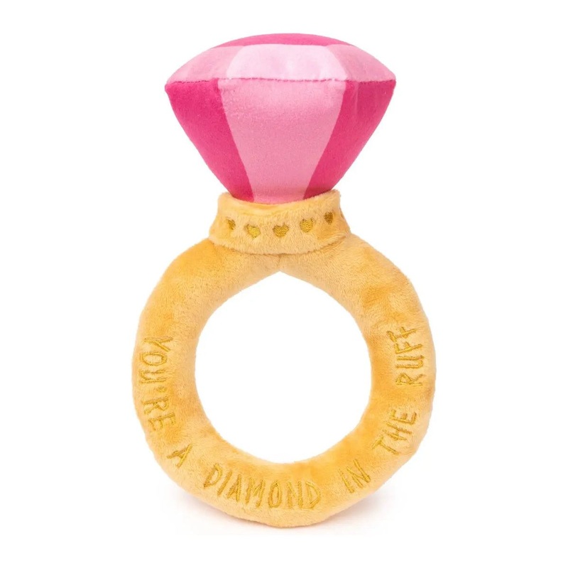 Celebrate your pups irresistible charm with the FuzzYard Diamond In The Ruff Ring Plush Dog Toyfit for the furry royalty in your life! Featuring a soft, plush pink gem and a golden band engraved with the sweet phrase, "Youre a Diamond in the Ruff," this to