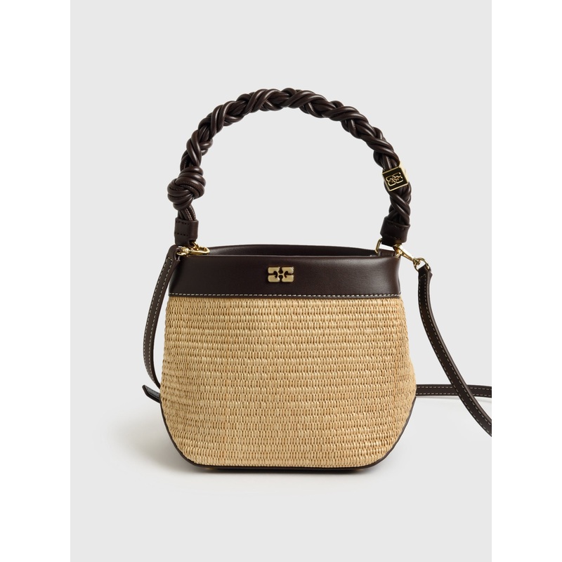 DESCRIPTION:This chic bag effortlessly blends natural textures and modern design. The woven straw body is complemented by a braided leather handle and drawstring closure, creating a unique and stylish accessory.FEATURES:Drawstring ClosureDetachable StrapRe