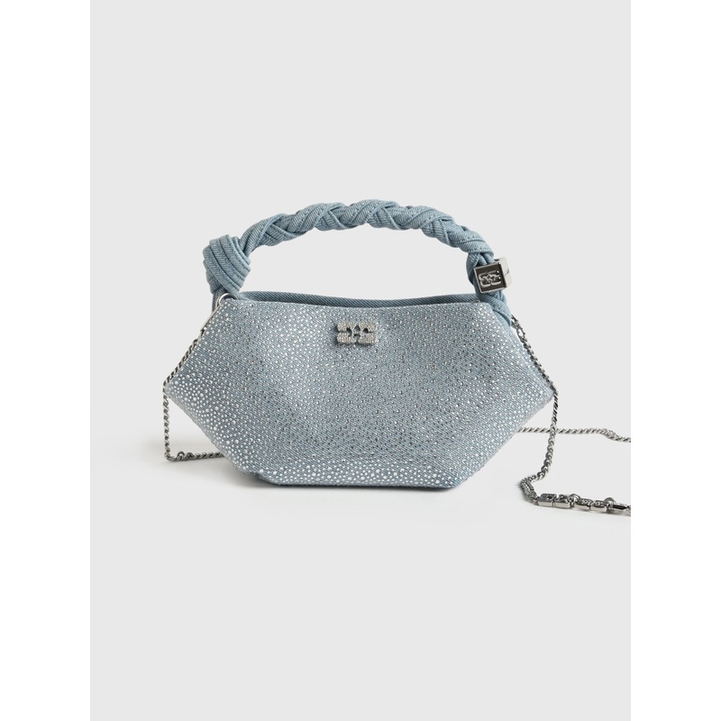 DESCRIPTION:Sparkle and shine with this icy blue mini bag. The shimmering fabric and unique braided handle create a glamorous and eye-catching accessory.FEATURES:Braided HandleDetachable StrapMagnetic ClosureInterior Card PocketRhinestone EmbellishmentsDim
