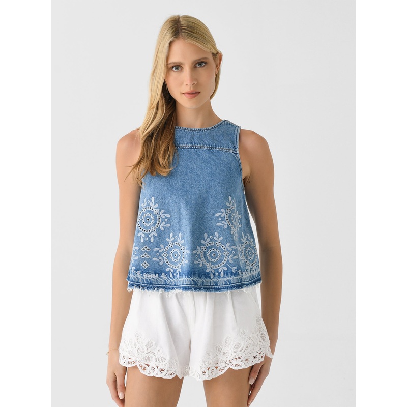 DESCRIPTION:This effortlessly chic denim top is perfect for adding a touch of bohemian flair to your wardrobe. The relaxed fit and delicate floral embroidery create a casual yet stylish look.FEATURES:Scoop NecklineWide StrapsBack Adjustable BuckleBroderie