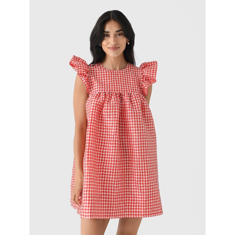 DESCRIPTION:A tunic-style dress with ruffled sleeves and a gingham print made from sustainable crinkled taffeta fabric.FEATURES:Round NecklineBack Button ClosureRuffle SleevesFull SkirtMini SilhouetteAll-Over Gingham Print100% Recycled PolyesterRelaxed Fit