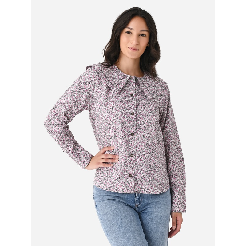 Floral-printed button-down shirt featuring a unique double-layered collar.