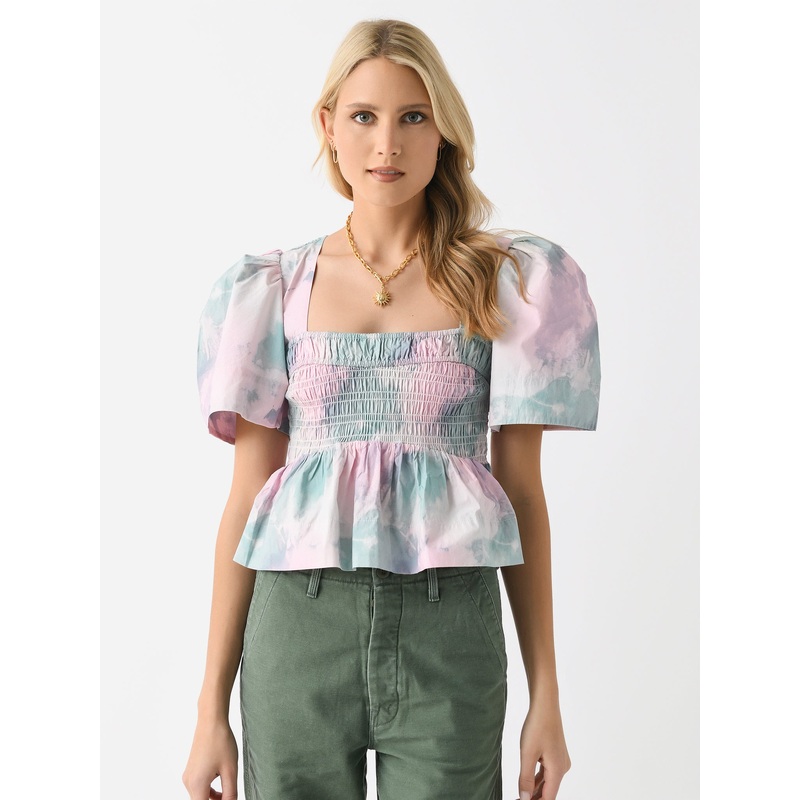 DESCRIPTION:A colorful smocked blouse with a feminine peplum hem.FEATURES:Square NecklineShort Puff SleeveSmocked BodicePeplum HemSlight Cropped SilhouetteAll-Over Novelty PrintPoplin Fabrication100% CottonClassic FitModel is wearing size US 4/EU 36 blouse