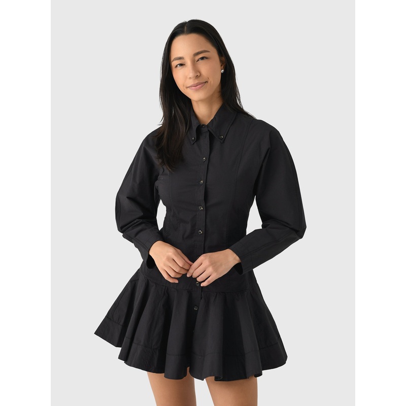 DESCRIPTION:This dress features a classic collar, a button-front closure, and a drop waist with a playful ruffled hem detail.FEATURES:Button-Down CollarLong SleevesButton-Down FrontGathered SkirtMini Silhouette97% Organic Cotton, 3% ElastaneClassic FitMode