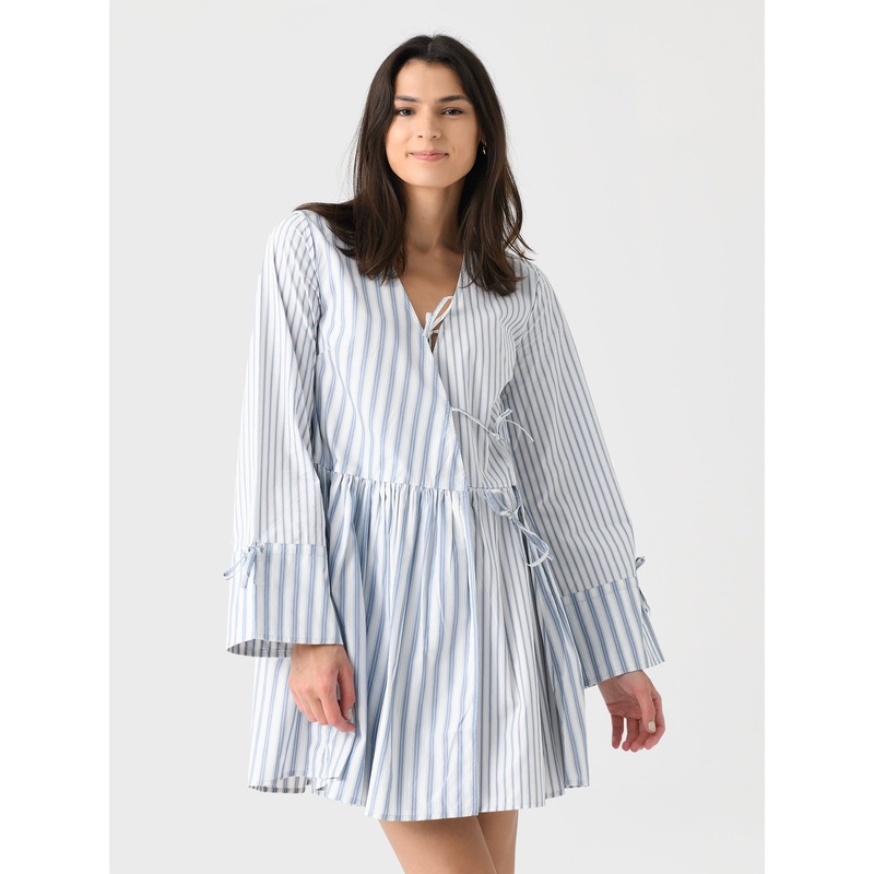 A striped mini dress made from lightweight organic cotton with self-tie details and a wrap silhouette.