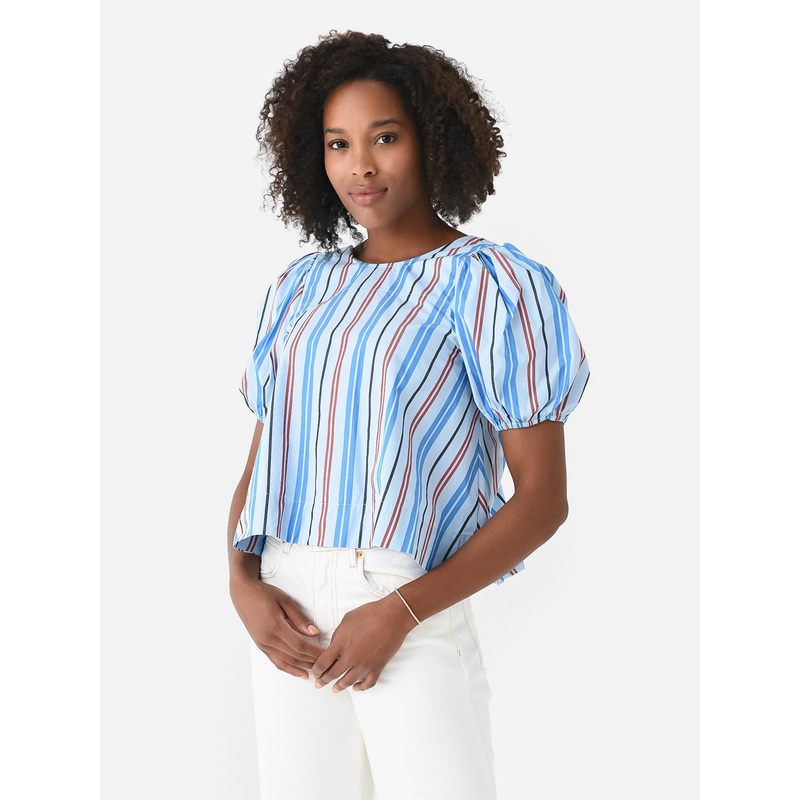 DESCRIPTION:Open-back top with puff sleeves and a vertical stripe print.FEATURES:Round NecklinePuff SleeveElastic CuffsOpen BackAll-Over Stripe Print100% CottonClassic FitModel is wearing size 38 top.Model's Measurements: Height: 5'10" | Bust: 34B | Waist: