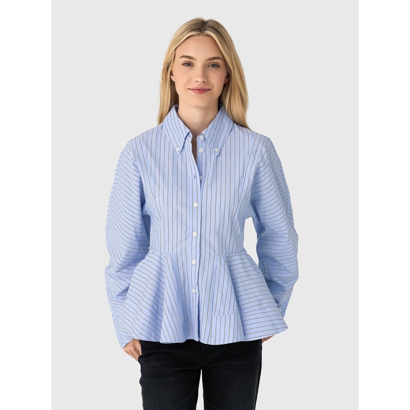 This elegant shirt features a classic buttoned collar, a button-front closure, and curved sleeves. The peplum silhouette creates a sophisticated and flattering fit.