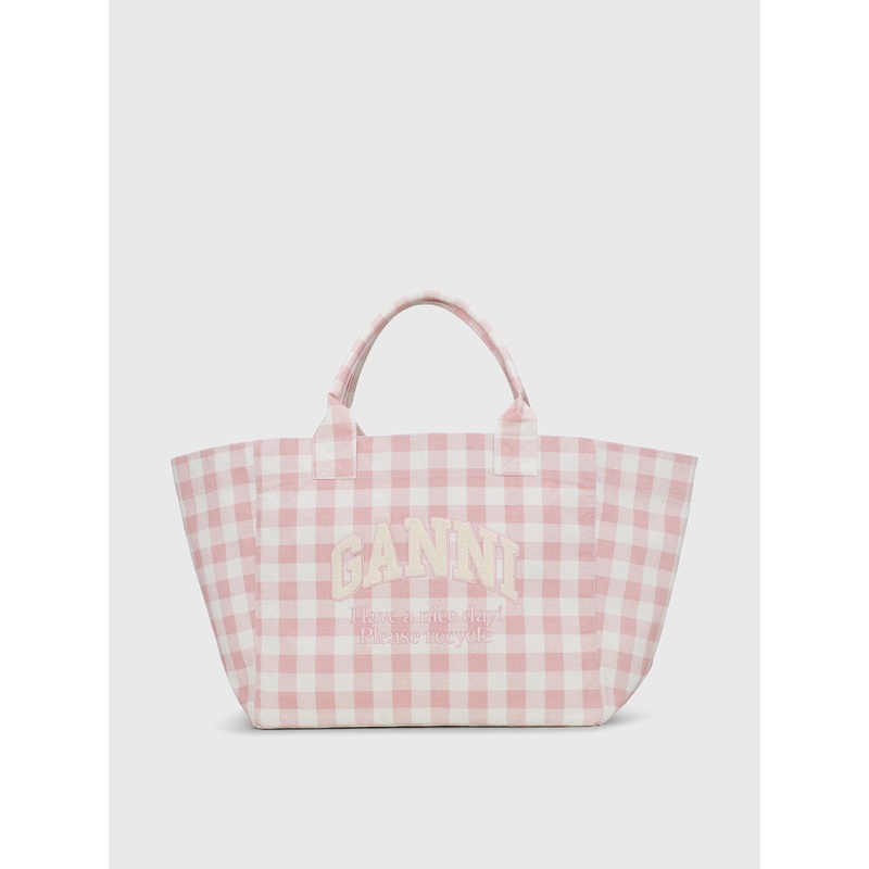 DESCRIPTION:This chic, checkered carryall tote bag prominently displays the GANNI logo, playfully accented with "Have a nice day! Please recycle." The stylish design is finished with convenient top handles and a spacious compartment, making it a functional