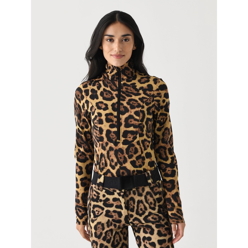 A half-zip base layer top made from soft power-stretch fabric and finished with a custom jaguar print.