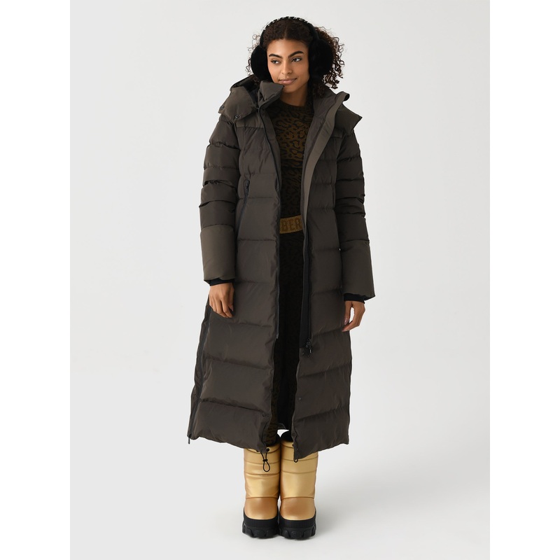 A long, hooded jacket made from sustainable material and filled with RDS-certified down insulation.