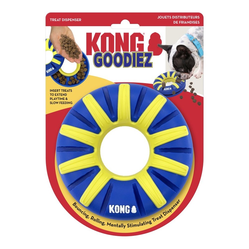 KONG Goodiez dispenses treats from between two durable layers from a gap that can be adjusted to 2 difficulty levels to satisfy dogs foraging instincts. This mentally stimulating food puzzle invites dogs to extract kibble by rolling and bouncing or by prying the sides apart. Fill top grooves with KONG Easy Treat to entice play. Twists open for easy filling and cleaning. Holds 1 cup kibblesgreat for weight maintenance.