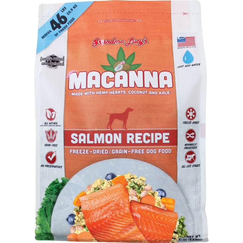 Ingredients:Salmon, Pinto Beans, Hemp Hearts, Carrots, Coconut, Pumpkin, Kale, Blueberries, Turmeric, Vitamin A Supplement, Vitamin D3 Supplement, Vitamin E Supplement, Niacin Supplement, Iron Proteinate, Calcium Carbonate, Phosphorous, Zinc Proteinate, Ri