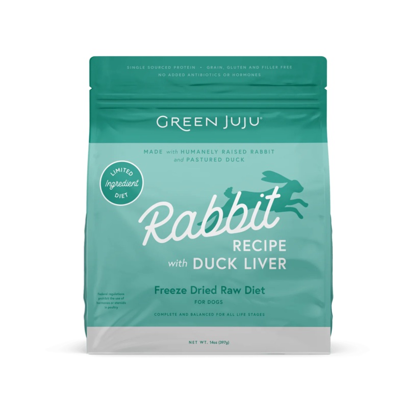 Green JuJu Freeze Dried Raw Limited Ingredient Rabbit & Duck Liver Recipe14 oz bag (397g) containing roughly 8.3 cups per bagOurRabbitRecipe with Duck Liver isa complete and balanced, limited-ingredient diet. Made fromhumanely sourced rabbit and pastured d