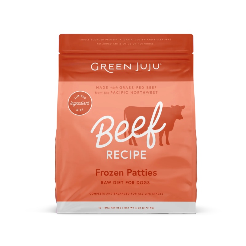 Green JuJu Beef Recipe Frozen Patties & SlidersOur Beef Recipe is a complete and balanced, limited-ingredient diet. Made from responsibly sourced, grass-fed beef, this organ-rich formula is a perfect base for your dog's everyday nutrition!Ingredients: Beef