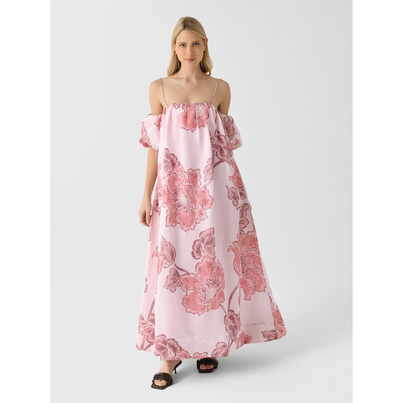 This stunning maxi features a flattering low straight neckline, a voluminous A-line silhouette, and detachable puff sleeves for versatile styling.