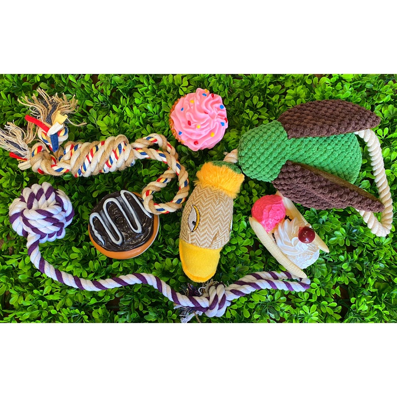 Playtime gets an even more exciting remix with this bundle of toys, special selected for your dog or as gift for a friend who just got a new pup! It comes with 6 toys to unleash your pups play potentiala plush duck that squawks, two rope toys, and three delicious looking squeaky toys made of thermoplastic rubber. Its everything your pup needs to dive into playtime, from textures that grab their attention to the sounds that keep them in the game, and soft fabrics that are perfect for cuddling too. Take the guesswork out of spending quality time together with this play-ready assortment of toys, so you can keep your dog happily active and wagging!