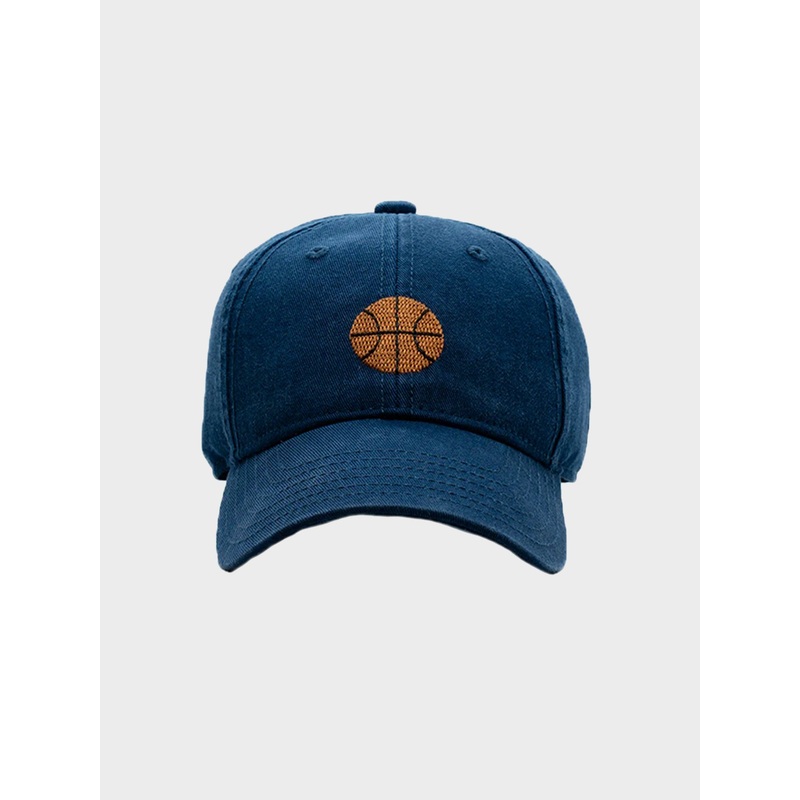 An adjustable hat made from pre-wash canvas fabric with a needlepoint embroidered basketball graphic.