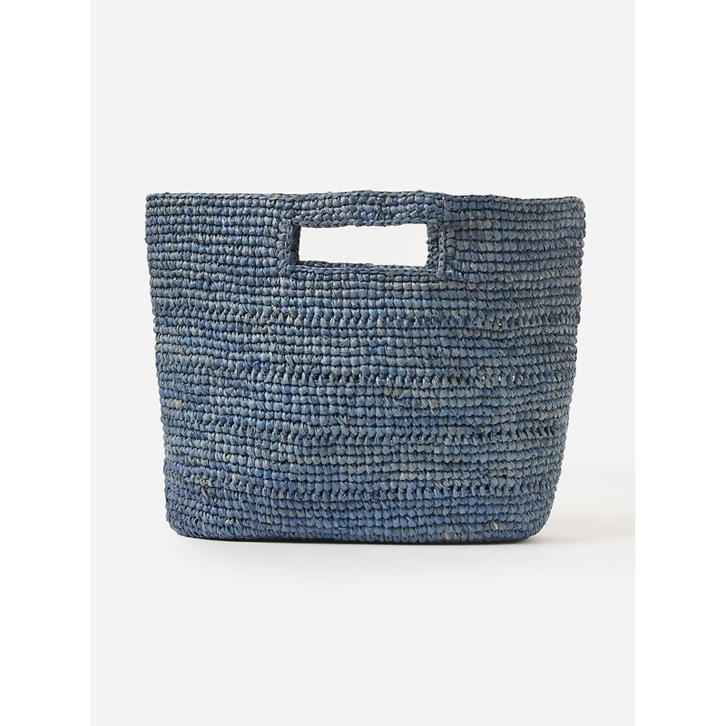 DESCRIPTION:A small grab-and-go style tote made from woven raffia fabric.
