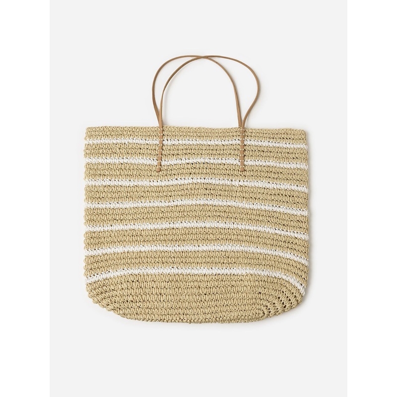 DESCRIPTION:A paper straw tote bag with a packable design, contrast stripes, and leather handles.