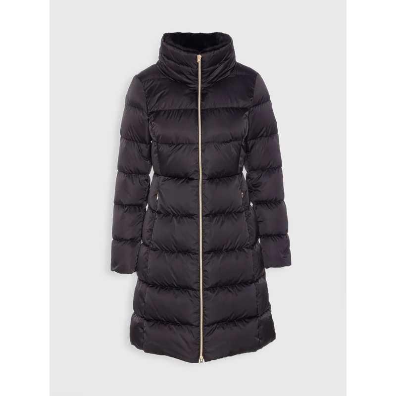 This elegant puffer coat is your go-to for winter warmth. It features a faux fur-lined collar and a sleek quilted design with a satin exterior and warm down insulation.