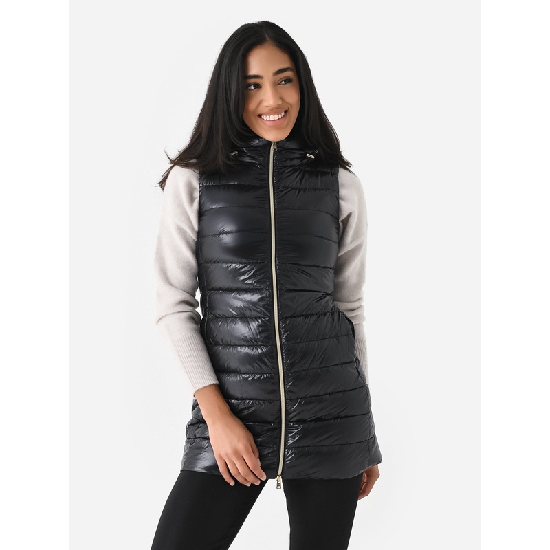 Lightweight vest with a long silhouette and injected with ultra-fine goose down padding.