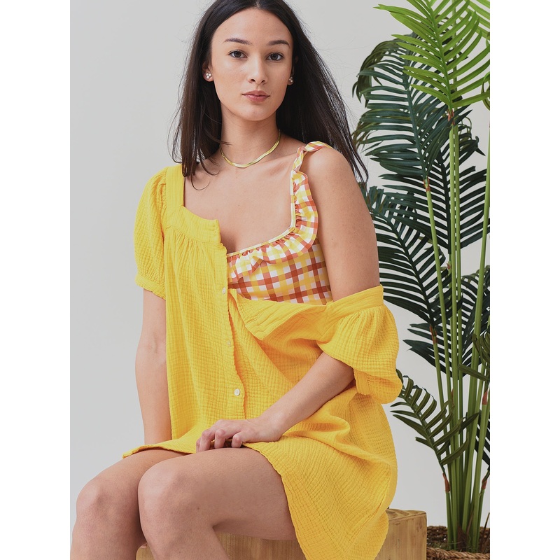 DESCRIPTION:Lightweight mini dress designed in a soft crinkle gauze fabric.FEATURES:Mini Dress/Swim Cover-UpSquare NecklineShort Puff SleeveScoop BackButton-Down FrontCrinkle Gauze Fabrication100% CottonRelaxed FitModel is wearing size Small dress.Pearl, P